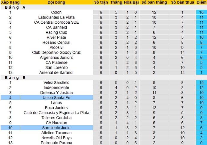 Trong khi đó Sarmiento Junín chỉ có được 6 điểm sau 6 vòng đấu, hiện đang đứng thứ 10 tại bảng B. Tuy chỉ hơn đội bét bảng Patronato có 3 bậc nhưng Sarmiento Junín đang có nhiều hơn tới 6 điểm.