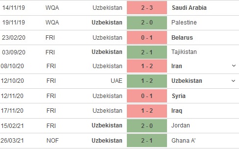 Trong 5 trận gần nhất Uzbekistan có được 3 trận thắng và để thua 2 trận. Thành tích sân nhà của đội bóng còn có phần tồi hơn, tuy nhiên sau 3 trận thua liên tiếp tại đây Uzbekistan đã có được 2 trận thắng trong năm 2021 trước Jordan và Ghana.