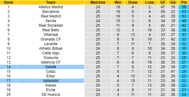 Valladolid sau 25 vòng đấu tại giải VĐQG Tây Ban Nha mùa này mới giành được 22 điểm, hiện đang xếp thứ 17 trên bảng xếp hạng với khoảng cách so với nhóm cầm đèn đỏ tính bằng chỉ số phụ. Trong khi đó Getafe với số trận tương tự đã giành được 27 điểm, xếp trên Valladolid 3 bậc ở nhóm an toàn. Dẫu vậy ở trận đối đầu sắp tới, Valladolid mang đến nhiều hứa hẹn vào khả năng giành chiến thắng.