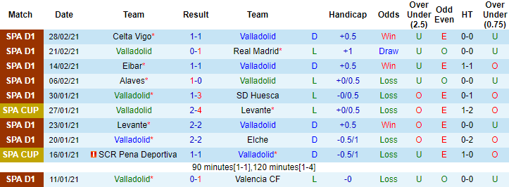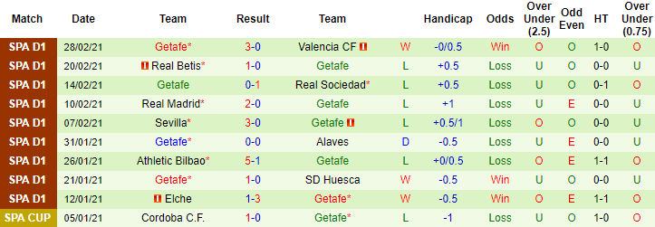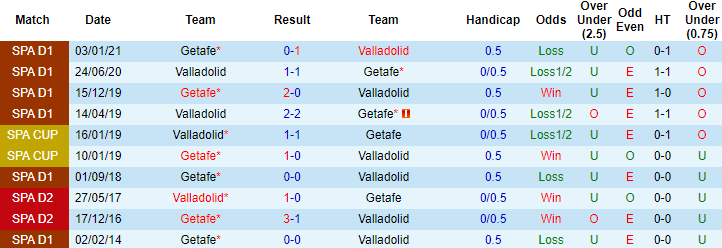 Trận đối đầu giai đoạn lượt đi La Liga 2020/21, Valladolid đánh bại Getafe với tỷ số 1-0 ngay trên sân khách. Giai đoạn gần đây Valladolid tạo được sự tin tưởng nơi người hâm mộ cùng chiến tích bất bại 3 trận liên tiếp theo kèo châu Á. Trong khi đó Getafe đã và đang gây thất vọng lớn ở các chuyến làm khách. 4 trận xa nhà gần đây trong khuôn khổ La Liga, Getafe toàn thua, thủng lưới 11 lần và chỉ ghi được 1 bàn danh dự.