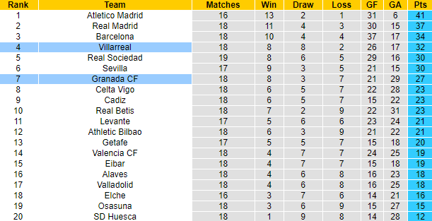 Sau 18 vòng đấu tại giải VĐQG Tây Ban Nha mùa này, Villarreal giành 32 điểm, xếp thứ 4 trên bảng xếp hạng. Với số trận tương tự, Granada giành 27 điểm, xếp ở vị trí thứ 7. Trận đối đầu gần nhất, Granada đã cầm hòa Villarreal với tỷ số 4-4 trên sân khách. Khoảng cách không nhiều, đối đầu không thuận lợi nhưng trận đấu sắp tới, Villarreal vẫn được tin tưởng vào khả năng giành chiến thắng thuyết phục.