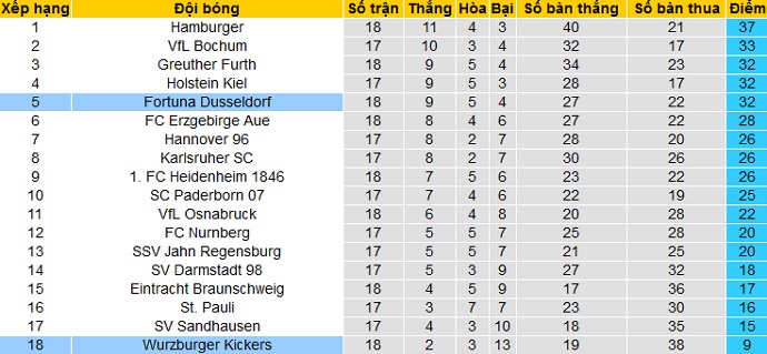 Bảng xếp hạng giải hạng nhì Đức trước vòng 19