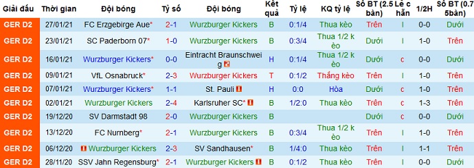 Thế nhưng trong 5 trận đấu gần đây Würzburger Kickers cũng có được 1 trận thắng, 2 trận hòa và để thua trong cả 2 trận gần nhất. Trên sân nhà thành tích của Würzburger Kickers cũng hoàn toàn tương tự nhưng ít ra đội bóng còn có được 2 trận hòa gần đây.