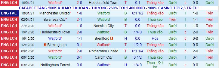 + Thống kê 10 trận gần nhất của Watford