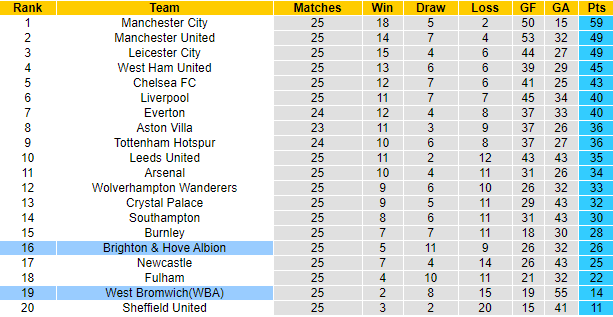 Sau 25 vòng đấu tại giải Ngoại hạng Anh mùa này, thành tích của Brighton tốt hơn hẳn so với West Brom. Cụ thể, Brighton đã giành được 26 điểm, xếp thứ 16 trên bảng xếp hạng, trong khi đó West Brom mới giành được 14 điểm, xếp thứ 2 từ dưới lên. Vì vậy ở trận đối đầu sắp tới, Brighton hoàn toàn xứng đáng được đánh giá cao hơn đối thủ trước giờ bóng lăn.