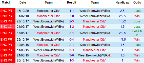 West Brom từ lâu đã trở thành con mồi ưa thích dành cho Man City. Lần cuối cùng đội chủ nhà giành chiến thắng trong các trận đối đầu trong khuôn khổ giải Ngoại hạng Anh đã diễn ra từ năm 2008 với tỷ số 2-1.
