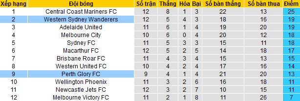 Trong khi đó Perth Glory hiện đã tụt xuống vị trí thứ 9 trên bảng xếp hạng với 13 điểm sau 9 vòng đấu. Hiện tại đội bóng đang còn cách Top 6 tới 4 điểm nhưng đang còn thi đấu ít hơn tới 3 trận.