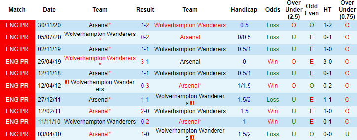 Trận đối đầu giai đoạn lượt đi Premier League mùa này, Wolves đánh bại Arsenal với tỷ số 2-1 ngay trên sân Emirates. Trong vòng 6 lần chạm trán Pháo thủ gần đây tính trên mọi đấu trường, Wolves bất bại tới 5 lần với 2 chiến thắng và 3 trận hòa.