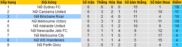 Trong khi đó Brisbane Roar (W) vẫn duy trì được phong độ khá ổn định khi đứng thứ ba trên bảng xếp hạng với 10 điểm sau 6 vòng đầu tiên. Trong mùa giải trước Brisbane Roar (W) chỉ về đích ở vị trí thứ 5 và không thể góp mặt tại vòng chung kết.