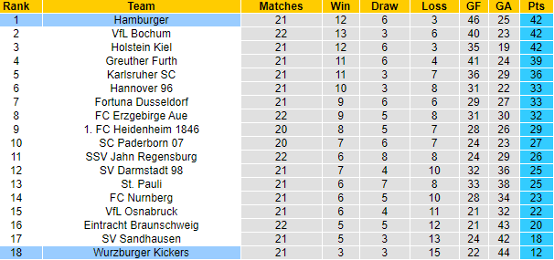 Sau 21 trận đã đấu, Hamburger giành được 42 điểm, đang ở ngôi đầu BXH. Họ bằng điểm với 2 đối thủ xếp sau và chỉ hơn đội thứ 4 là Greuther Furth có 3 điểm, cách biệt vẫn có thể bị san lấp. Nên nhớ là giải hạng 2 Đức chỉ có 2 đội dẫn đầu giành vé thăng hạng trực tiếp.