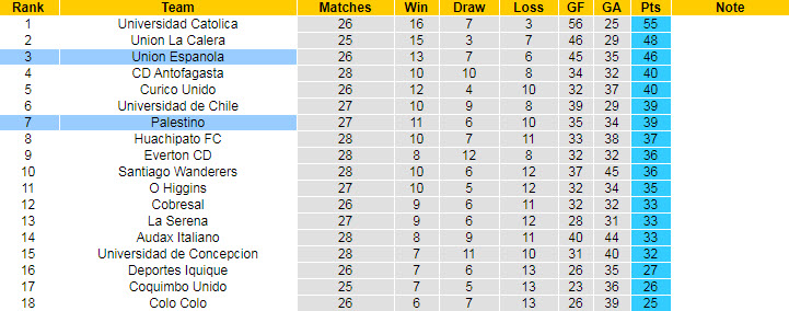 Tuy nhiên, đây vẫn chưa phải thời điểm Palestino được phép mất tập trung khi họ chỉ hơn nhóm không được tham dự Copa Sudamericana khoảng cách 3 điểm. Trở lại với lượt trận cuối tuần này, đội bóng của HLV Sierra sẽ có 90 phút đầy khó khăn khi chạm mặt đội đứng thứ 3 Union Espanola.