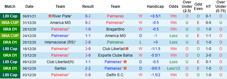 Palmeiras chỉ cần cầm bóng 30% ở lượt đi đã có thể thắng 3-0. Đội bóng Brazil cho thấy khả năng chơi phòng ngự phản công vô cùng lợi hại. Lượt về sắp tới, River Plate buộc phải tiếp tục chủ động dâng cao tấn công để hy vọng lội ngược dòng. Khi đó Palmeiras tiếp tục có nhiều cơ hội để giành chiến thắng. Trên sân nhà, 11 trận gần đây Palmeiras thắng 10 trận cả về tỷ số và kèo châu Á.
