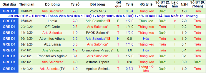 - Thống kê 10 trận gần nhất của Aris Salonica