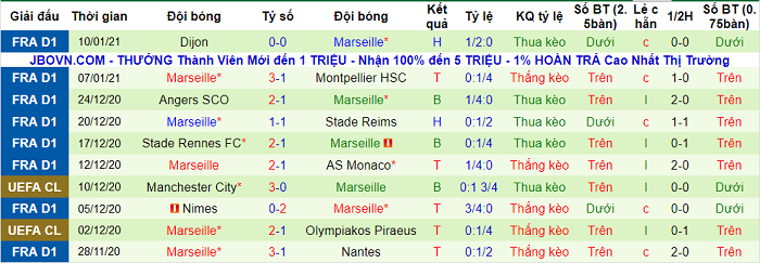 - Thống kê 10 trận gần nhất của Marseille