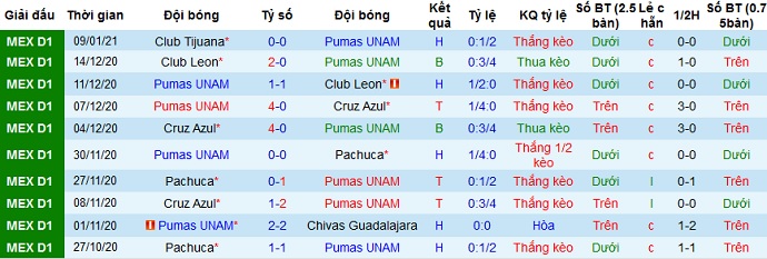 + Thống kê 10 trận gần nhất của Pumas UNAM