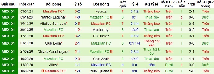 + Thống kê 10 trận gần nhất của Mazatlán