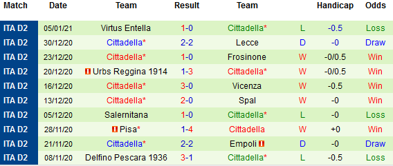 + Soi tỷ lệ kèo châu Á: Cittadella đang có thành tích đối đầu nhỉnh hơn với liên tiếp 4 trận đều bất bại. Theo kèo châu Á, Cittadella cũng đáp ứng được lòng tin của nhà đầu tư cả 3 trận đối đầu được niêm yết tỷ lệ gần đây.