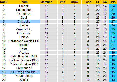 Con đường trở lại Serie A của Cittadella vẫn đang đi đúng hướng. Mặc dù đá ít hơn các đội phía trên 2 trận nhưng đội khách chỉ bị đối thủ ở vị trí nhì bảng bỏ cách 4 điểm.
