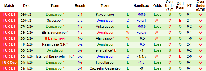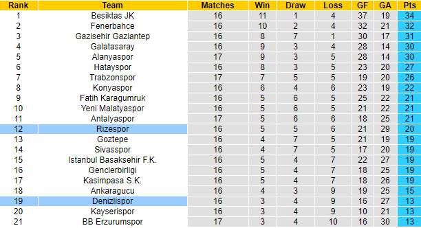 Sau 16 vòng đấu tại Super Lig 2020/21, Denizlispor mới giành được 13 điểm, xếp thứ 19 trên bảng xếp hạng. 3 trận gần đây Denizlispor chỉ giành được 1 trên 9 điểm tối đa và dự kiến họ sẽ còn tiếp tục sa sút vì đội hình sứt mẻ, có tới 5 trụ cột dính chấn thương dài hạn.
