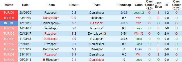 Tính riêng trong khuôn khổ giải VĐQG Thổ Nhĩ Kỳ, Denizlispor bất bại cả 3 trận đối đầu Rizespor gần đây với 2 chiến thắng và 1 trận hòa. Dẫu vậy, ở lần tái đấu sắp tới, Denizlispor khó cho thấy cơ hội thoát thua.