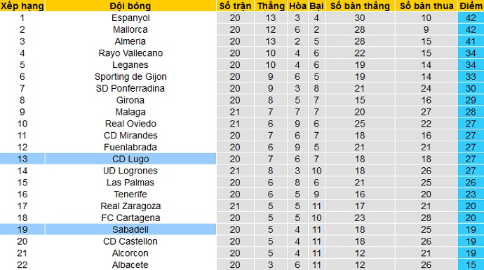 Trong khi đó Lugo đang có được 27 điểm cũng sau 20 vòng đấu nhưng bằng điểm với 4 đội bóng khác và chỉ hơn kém về hiệu số bàn thắng. Tạm thời Lugo đang đứng ở vj trí thứ 14 của bảng xếp hạng, cách các đội trong Top 6 tới 6 điểm nhưng hơn nhóm cầm đèn đỏ tới 8 điểm.