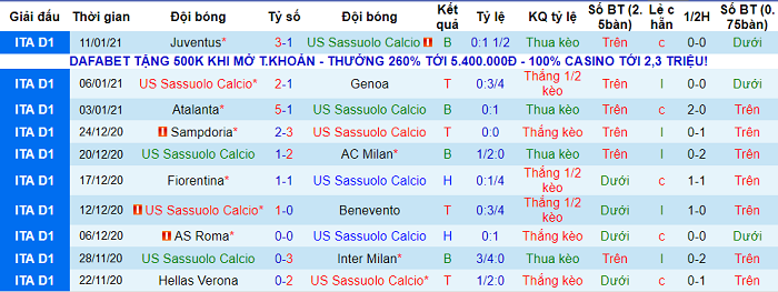 - Thống kê 10 trận gần nhất của Sassuolo