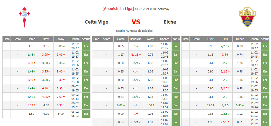 BIẾN ĐỘNG TỶ LỆ KÈO CHẤP CELTA VIGO VS ELCHE