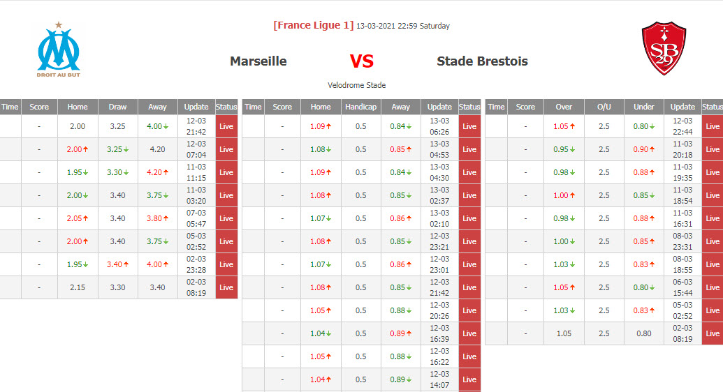 BIẾN ĐỘNG TỶ LỆ KÈO CHẤP MARSEILLE VS BREST