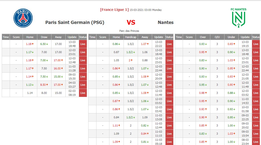 BIẾN ĐỘNG TỶ LỆ KÈO CHẤP PSG VS NANTES