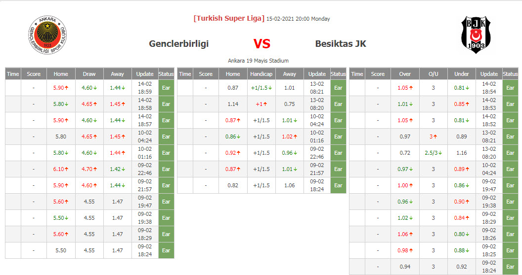 BIẾN ĐỘNG TỶ LỆ KÈO CHẤP GENCLERBIRLIGI VS BESIKTAS