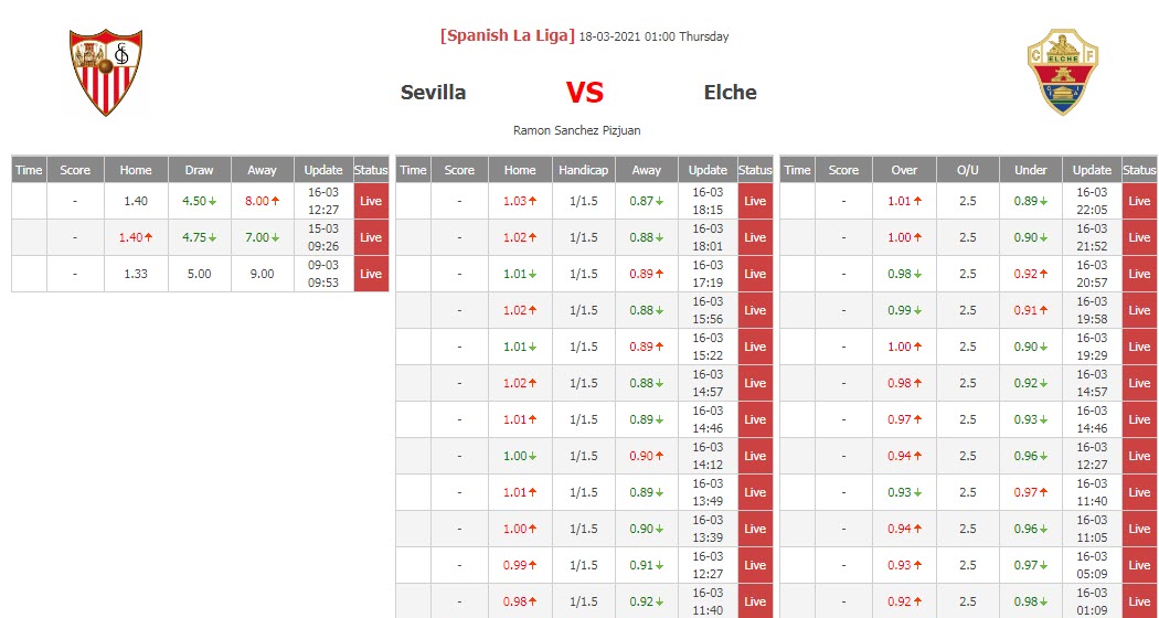 BIẾN ĐỘNG TỶ LỆ KÈO CHẤP SEVILLA VS ELCHE
