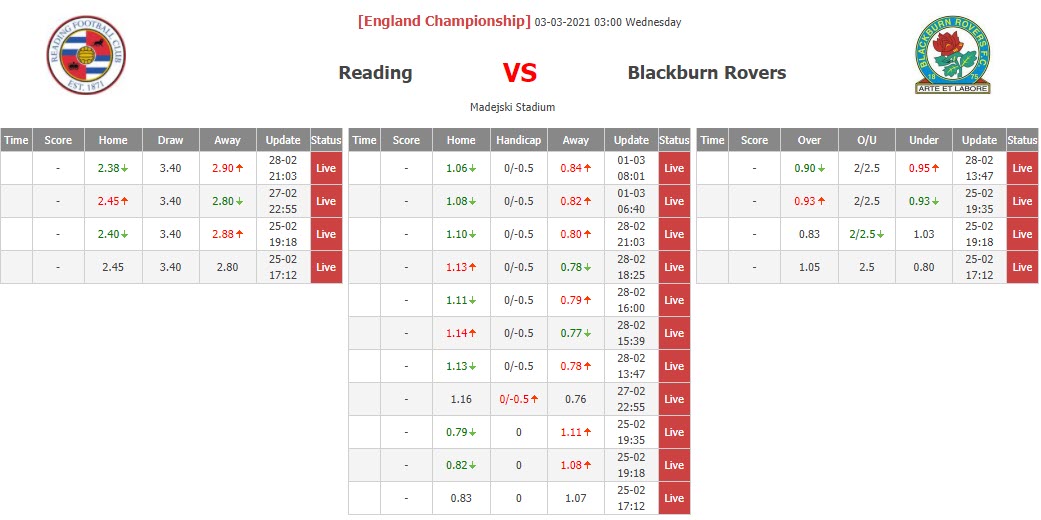 BIẾN ĐỘNG TỶ LỆ KÈO CHẤP READING VS BLACKBURN