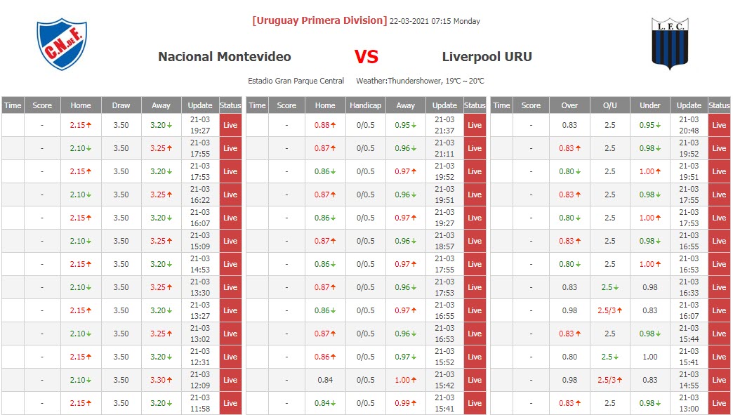 BIẾN ĐỘNG TỶ LỆ KÈO CHẤP NACIONAL MONTEVIDEO VS LIVERPOOL URU