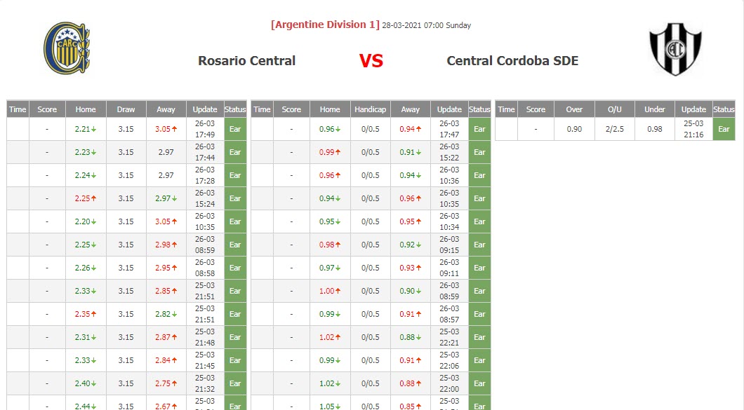 Theo đánh giá của giới điều hành châu Á, Rosario Central là đội bóng có khả năng giành thắng lợi cao hơn Central Cordoba. Bằng chứng, họ đã đưa ra mốc kèo chấp đồng banh dành cho Rosario Central.