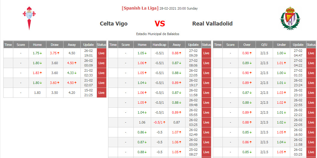 BIẾN ĐỘNG TỶ LỆ KÈO CHẤP CELTA VIGO VS VALLADOLID