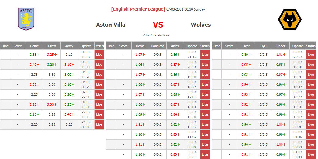 BIẾN ĐỘNG TỶ LỆ KÈO CHẤP ASTON VILLA VS WOLVES