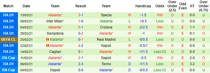+ Thống kê 10 trận gần nhất của Atalanta