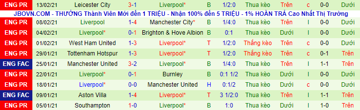 + Thống kê 10 trận gần nhất của Liverpool