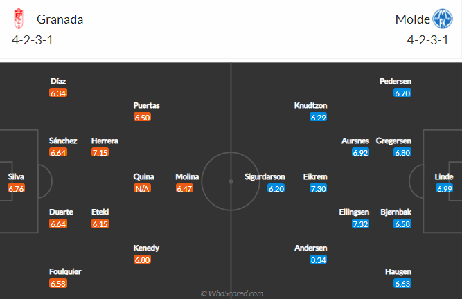 Lần đầu gặp nhau và đá lượt đi, cả Granada và Molde đều buộc phải thi đấu thận trọng, không hứa hẹn dồn đội hình lên chơi tấn công vì rất dễ bị "gậy ông đập lưng ông". Các tình huống tấn công bị hạn chế, bóng ít được đưa xuống gần khu vực đường biên ngang, những quả phạt góc vì thế khó xuất hiện với tần suất cao.