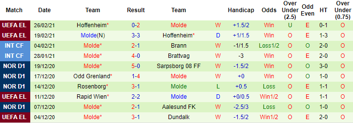 + Thống kê 10 trận gần nhất của Molde