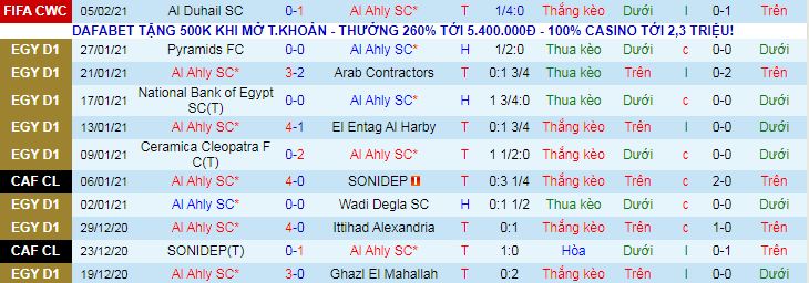 Al Ahly bất bại 20 trận liên tiếp gần đây với 16 chiến thắng. Hàng thủ Al Ahly giữ sạch lưới 3/4 trận gần đây. Bayern Munich toàn thắng 5 trận liên tiếp vừa qua, nhưng để thua kèo châu Á 5/7 trận gần nhấtHàng phòng ngự Bayern Munich cũng giữ sạch lưới 3/4 trận gần đây.