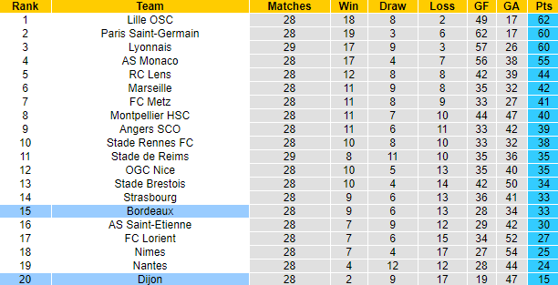 Trên sân nhà, Dijon không thể ghi bàn 4 trận liên tiếp gần đây. Trong khi đó Bordeaux cũng chỉ ghi được 1 bàn thắng ở 5 lần xuất quân vừa qua tính trên mọi đấu trường. Hàng công yếu kém của hai đội rõ ràng khó hứa hẹn tạo ra quá 2 bàn thắng ở cuộc so tài diễn ra vào tối 14/3.