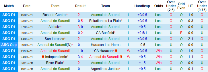 + Thống kê 10 trận gần nhất của Arsenal Sarandi