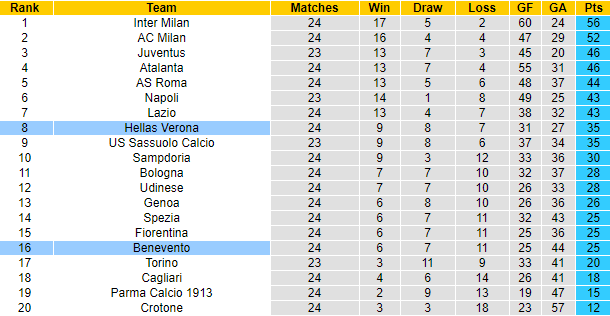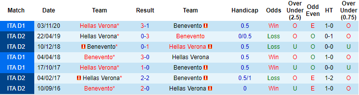 Thực tế cho thấy khi đối đầu một Hellas Verona được đánh giá đồng cân đồng lạng, Benevento luôn tự tin chơi tấn công. Giai đoạn lượt đi Serie A mùa này, Hellas Verona và Benevento cùng nhau tạo nên 4 bàn thắng sau 90 phút với tỷ số chung cuộc 3-1 nghiêng về phía đội bóng thành Verona.