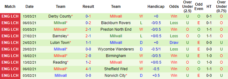 Trong vòng 7 trận gần đây của Millwall, 5 trận kết thúc mà không thể vượt mốc 2 bàn thắng. Trên sân khách, 10 trận trước đó của Millwall có 7 trận hạ màn với kịch bản có ít hơn 2,5 pha ghi bàn. Sau 36 vòng đấu tại Championship mùa này, Millwall mới ghi được 35 bàn thắng.