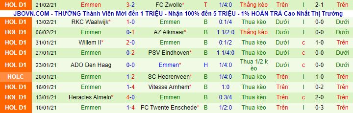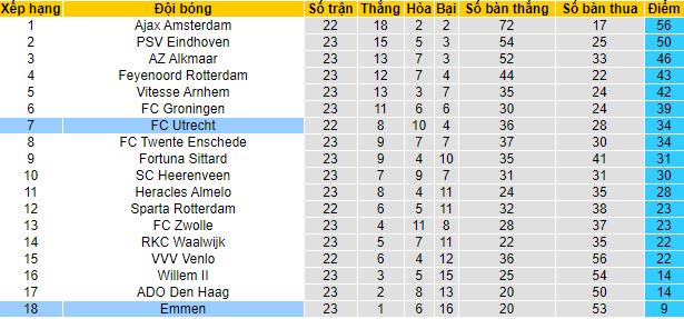 Hàng thủ Emmen lại đang thi đấu như mơ ngủ với 53 bàn thua sau 23 vòng đấu đã qua. Hai trận đối đầu gần nhất với Utrecht thì Emmen đều thủng lưới 3 bàn. Chỉ có điểm đáng khích lệ là họ vẫn biết cách chọc thủng lưới đối thủ này 3 lần trong 2 trận đấu đó. Những thông số báo hiệu một ngày bội thu bàn thắng sắp đến ở cặp đấu này.