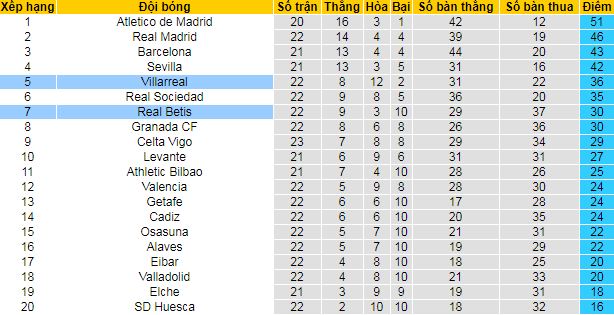 Villarreal đang dần đánh mất lợi thế trong cuộc đua top 4 mùa này khi phải chia điểm liên tiếp ở cả 4 vòng đấu vừa qua. Với sự sa sút đó, hiện tạo họ đã bị đánh bật khỏi top 4 khi đang kém nhóm này tới 6 điểm và đã thi đấu nhiều hơn 1 trận.