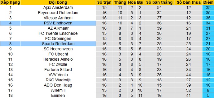 Trong khi đó PSV Eindhoven đang đứng thứ tư trên bảng xếp hạng với 34 điểm cũng sau 16 vòng đấu. Đây cũng là vị trí của đội bóng trong mùa giải trước khi không thể có được suất tham dự thẳng Europa League. Tuy nhiên hiện PSV Eindhoven chỉ kém đội thứ ba Vitesse 1 điểm và kém cả 2 đội đứng đầu đúng 2 điểm.
