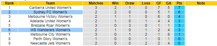 Bên kia sân, Sydney FC (W) sớm cho thấy vóc dáng của đương kim á quân khi toàn thắng cả 2 lượt trận. Lúc này, họ tạm thời đứng ở vị trí thứ 2 và kém đội đầu bảng Canberra United (W) đúng 1 điểm song đá ít hơn trận.