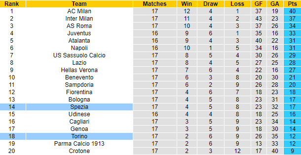 Sau 17 vòng đấu tại giải VĐQG Italia mùa này, Spezia giành 17 điểm, xếp thứ 14 trên bảng xếp hạng. Giai đoạn gần đây đội bóng tân binh thi đấu khởi sắc trông thấy, 2 vòng đấu gần nhất tại Serie A họ toàn thắng với tỷ số 2-1. Trong khi đó Torino vẫn đang trên đà sa sút, 10 trận vừa qua tính trên mọi đấu trường họ để mất điểm 9 lần (thua 4, hòa 6). Trên bảng xếp hạng lúc này, Torino xếp thứ 18 với 12 điểm sau 17 trận.